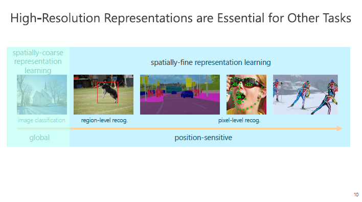 但是在其它任务中,比如检测,我们需要知道检测框的空间位置,比如分割,我们需要每个像素的标签,在人脸和人体的关键点的检测中,我们需要关键点的空间位置,这样一系列的任务实际上需要空间精度比较高的表征,我们称之为高分辨率表征。