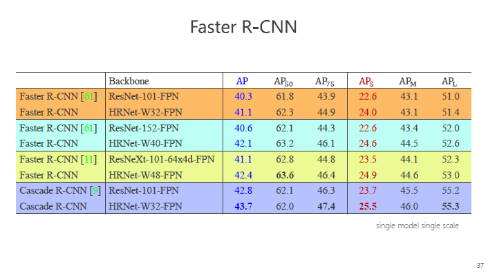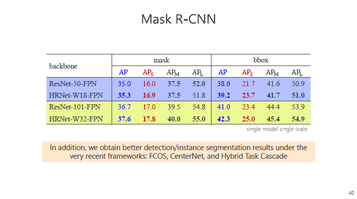 在最流行的Faster R-CNN框架里,我们用HRNet和ResNet的方法进行对比,为保证公平,分成4组,在每组参数量和计算量可比的情况下进行对比。