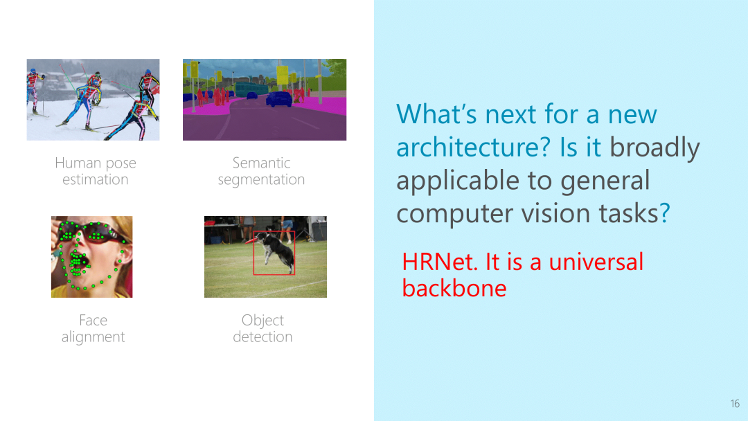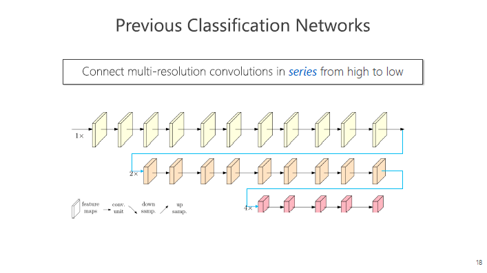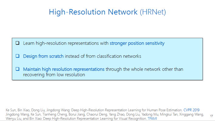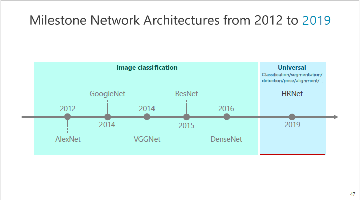 2012年以来AlexNet、GoogleNet、VGGNet、ResNet、DenseNet等是为了做分类任务,HRNet除了可以做分类任务,且性能很好,还可以做分割、检测、识别等等各种任务,面部检测、行人的检测、高空图像识别,卫星图象识别,也都有很好的效果。