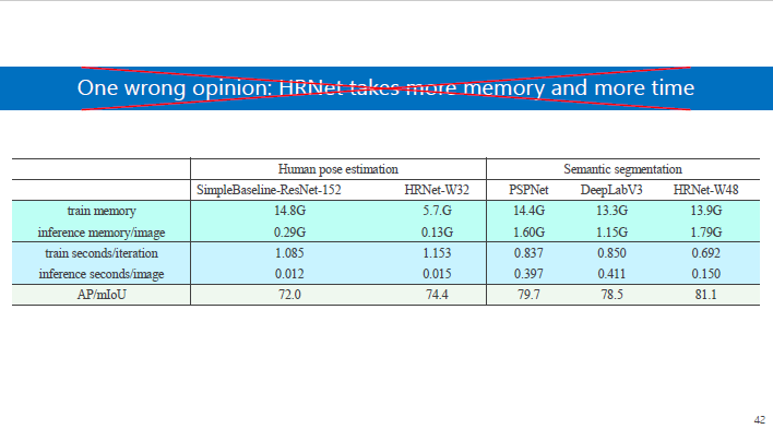 HRNet出来时,有人怀疑是否其参数量、计算量变大,事实上,我们并没有增加参数量和计算量,或者说增加网络结构的复杂度来提升性能,比如上图中,各项参数中两者计算量差不多,但是结果是HRNet更好。