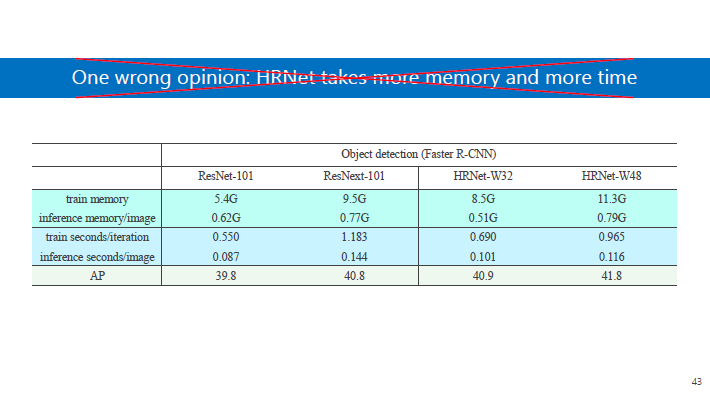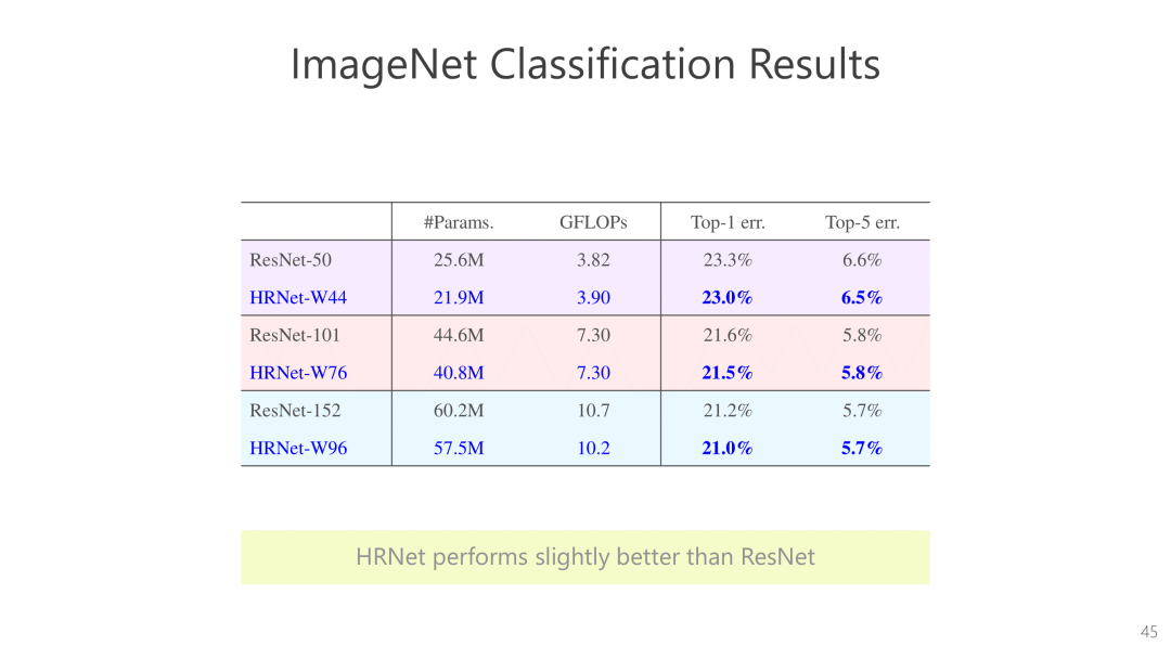 当初我们做这个网络结构的目的是为了提出一个高分辨率表征,以帮助分类以外的任务。后来发现,在同等参数量和计算量基础上,HRNet的结果比ResNet好。