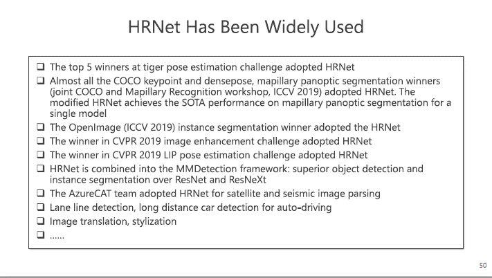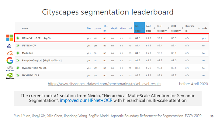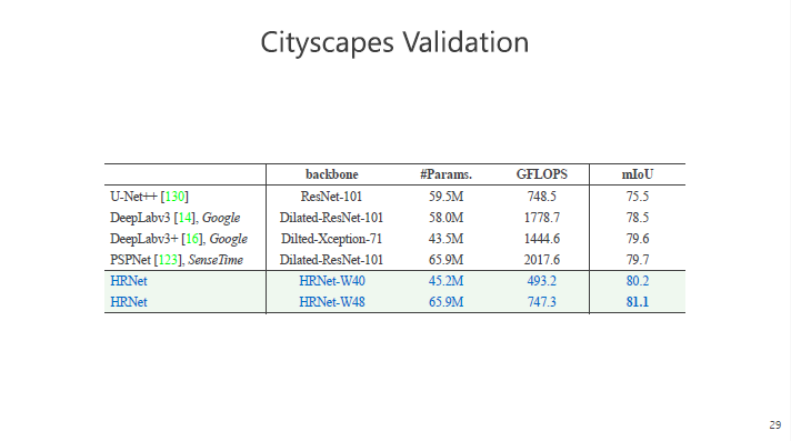 在今年4月份之前,我们在Cityscapes分割的榜单中排名第一。5月份,英伟达的一个新方法排名第一,了解过他们的方法后,发现它最终的结果是基于HRNet,再加上它的模块,从这个角度看,说明HRNet的影响力在分割任务上逐步变大。