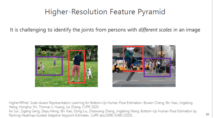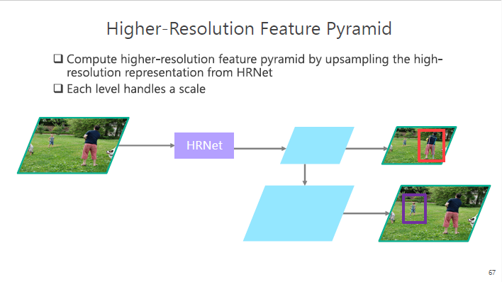 其中有个关于人体大小不一的问题,以前的方法没有确切的解决方式,我们提出“高分辨率特征金字塔”的方法。把图形输入到HRNet中做一个表征,从小的特征中分辨大的,从大的特征里面分辨小的,这个方法的结果表现也是非常好。