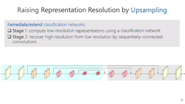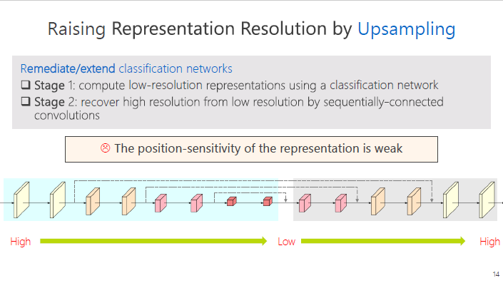 学习高分辨率表征,有一种叫上采样的方法。包括两个步骤,第一个步骤是分类的网络架构,表征开始比较大,然后慢慢变小;第二个步骤,通过上采样的方法逐步从低分辨率恢复高分辨率。