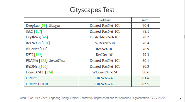 Cityscapes Test数据集的结果看,HRNet的表现也是最好的。