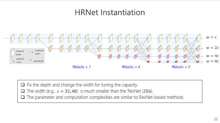 我们采用变化宽度的方式。与ResNet比,这个结构中的宽度小很多,比如之前ResNet的宽度是256,HRNet的宽度是32-48。正因为这样的设计,我们最终得到的参数和计算复杂度与ResNet的结果是可比的。