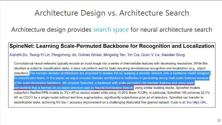 最近大家对网络结构搜索了解较多,既然有了搜索,为什么还要有网络结构设计?网络结构设计实际上是为搜索提供了一个空间,这也是非常重要的。今年CVPR上的一篇来自谷歌的文章,它的出发点与HRNet非常相似,认为以前的网络都是通过空间变大然后变小再恢复,这样对一些识别和检测任务非常不友好,他设计一个NAS的算法,来解决这个问题。