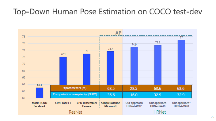 我们看看自上而下的方法的结果,下图左边是基于ResNet的方法,右边是HRNet的方法,比较的指标是关键点位置寻找准确与否。我们的结果是74.9%,结果要好于ResNet,同时参数量上,ResNet是68.5,我们是28.5。通过进一步加宽HRNet网络结构后,可以进一步提高结果。