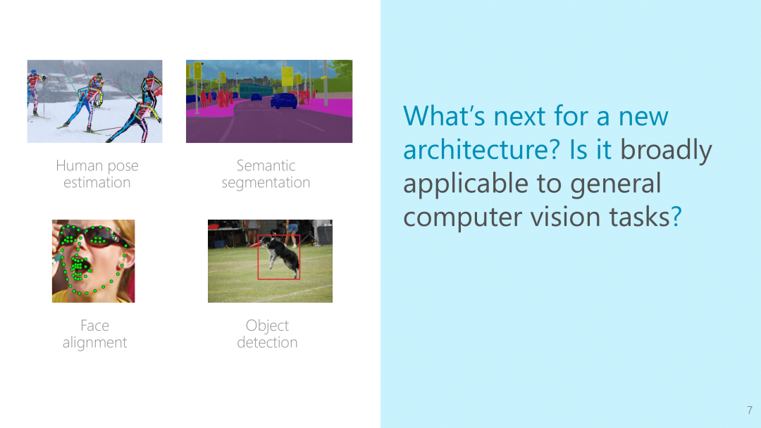 王井东介绍,目前学界的网络结构都是围绕分类任务而发明,除了分类以外,在计算机视觉里面还有其它的重要任务,比如图像分割、人脸关键点的检测、人体姿态估计、目标检测等等。