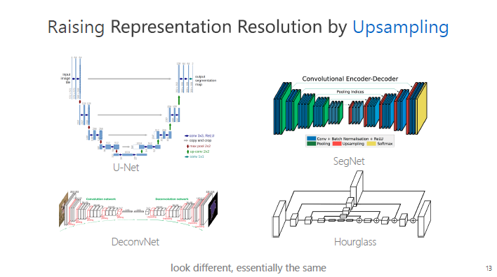 前面提到的几个结构,包括GoogleNex、VGGNet、ResNet等等,都是通过这种方式,逐步减小空间的大小,最终得到一个低分辨率的表征。低分辨率的表征在图像分类任务中是足够的,因为在图像分类里面,只需要给一个全局的标签,而不需要详细的空间信息,我们称之为空间粗粒表征的学习。