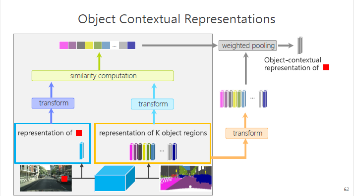 OCR的方法涉及鸡生蛋还是蛋生鸡的问题。我们事先并不知道分割,是先估计一个粗略的分割,有一个当前的表达,比如下图,取红色像素点的特征,把它输入到模块里,得到红色像素点当前的特征和其它的若干特征(K object regions),然后把这些特征经过变换,算出它们之间的相似度,根据相似度,经过加权池化(weighted pooling),然后得到像素点的表征,根据这个表征以及以前的表征一起进行预测。
