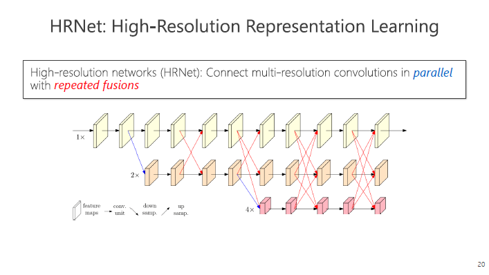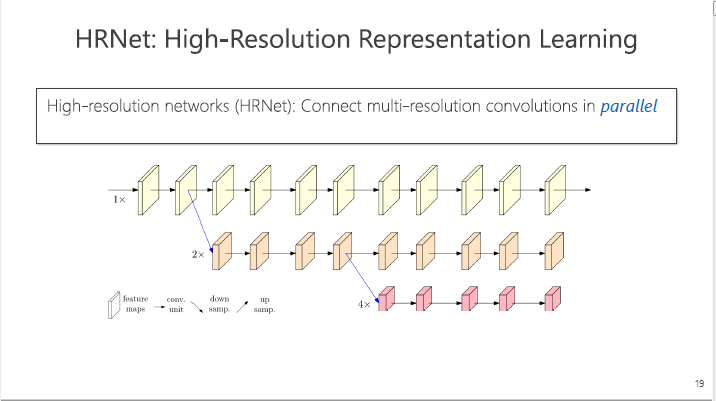 他们让高中低分辨率不停地交互,使得高分辨率可以拿到低分辨率语义性比较强的表征,低分辨率可以拿到高分辨率的空间精度比较强的表征,不停地融合,最终取得更强的高分辨率表征。