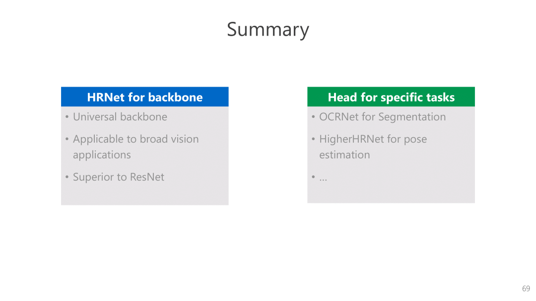 最后简单总结一下,我讲的主要是HRNet,作为一个通用的网络结构,给大家展示了在视觉分割、检测、人体关键点、人脸关键点的预测等任务,一系列的结果都比ResNet好,目前已经成为一个标准的方法之一。除此以外,我们基于具体任务的网络结构设计,比如加上OCR的方法、高分辨率特征金字塔(Higher-Resolution FeaturePyramid)的方法取得的效果都非常好。