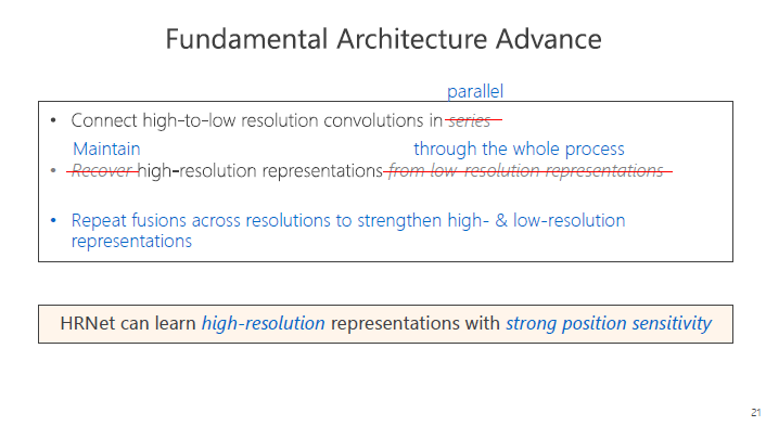 简单来讲,以前的高分辨率是通过升高、降低再升高获得,我们通过将不同分辨率的卷积由串联变成并联,自始至终保持高分辨率,并且还加入不同分辨率之间的交互,使得高分辨率表征和低分辨率表征的变强,获得对方的优势特征,最终获得非常强的高分辨率表征。