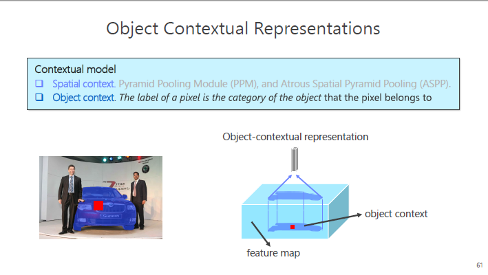 我们的方法是Object context(对象上下文),它的出发点非常简单,正如前面提到,像素点本身没有标签,标签来自于这个像素点所在的物体,比如下图红色的点,这个位置很难有标签,它的标签来自于这个车。运用这个出发点,我们思考路径是:能不能拿到这个红色像素点所在的物体特征,来帮助表达这个红色的像素点。基于这个出发点,我们提出了OCR方法。