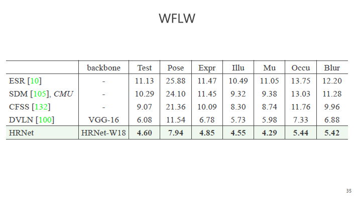 下图展示的是在一个最新数据集上的结果,人脸关键点上有98个点,在测试数据集上,指标衡量的是预测的点与人工标注的点之间的差距,HRNet的数值比之前的都小,差距最小。除此之外还列出了6种不同复杂条件,比如人脸姿态的变化、表情的变化、光照、是否化妆、是否遮挡,图片清晰程度,一系列的情况下,我们的结果都比以前的方法好。