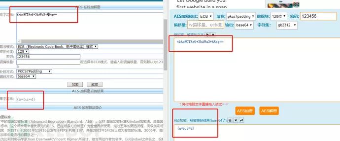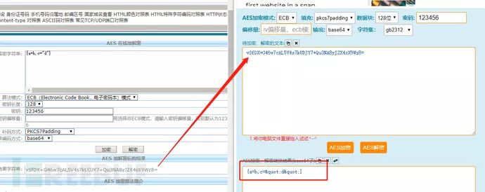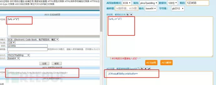 下面说下原理,上图左部分的网站,会把我输入的{a=b,c="d"} 里面的双引号,先html转义之后,然后再进行ECB加密。