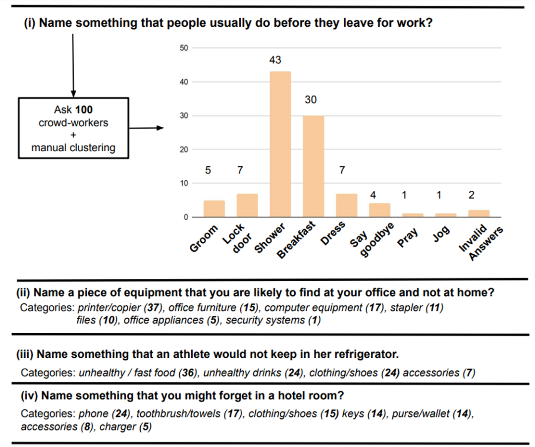 ProtoQA 是开放场景下基于常识推理的生成式问答基准数据集。例如说出人们在离开家上班之前通常会做的事情 (Name something that people usually do before they leave for work?)(图 1)