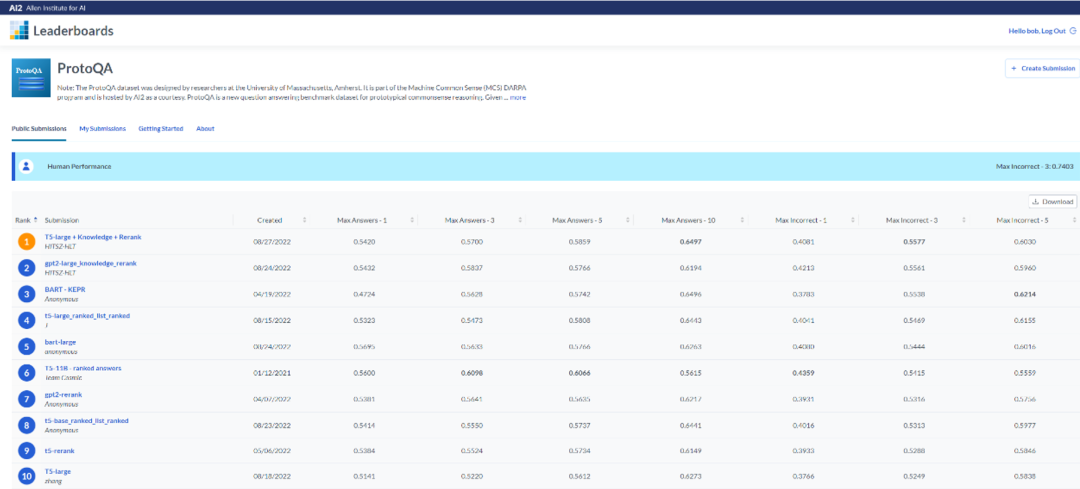 哈工大深圳 HLT 研究组于 2022 年 8 月 24 日获得 AI2 Leaderboards 中 ProtoQA 榜首。而后另一模型再次刷新榜首的记录。目前霸榜前两名。榜上第三和第六名分别被匿名团队和 Team Cosmic 获得。此外,还有 CMU/Bosch/USC,UMass Amherst,MOWGLI / USC INK Lab,USC LUKA,MOWGLI / USC LUKA,MOWGLI / Stanford 等团队参加(以上为非匿名团队)。