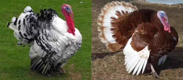 开头我们已经见过白色型家火鸡了,这两只是黑白色型和棕白色型的个体。左图:Hans Ulrich H. / Panoramio;右图:Mtshad / wikipedia