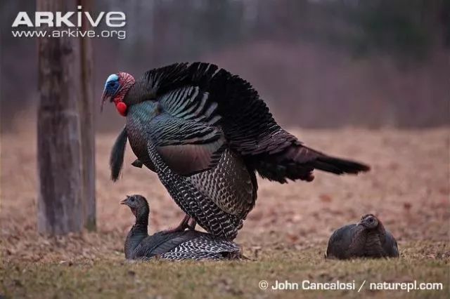 五彩斑斓的眼斑火鸡,左右雌鸟中间雄鸟。雄鸟开屏十分美丽。图片:Ray Wilson