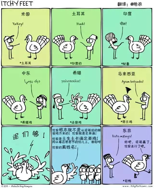 美国人管火鸡叫“土耳其”;土耳其人管火鸡叫“印度”,而印度人嘛——