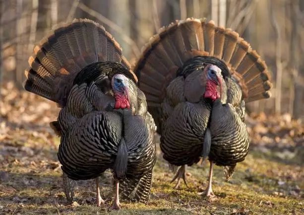 火鸡在求偶时会“开屏”。同为雄鸡,“开屏”的眼斑火鸡比野生火鸡要华丽得多,每根尾羽末端都像孔雀和孔雀雉一样有“眼斑”(眼斑火鸡的名字就是这么来的)。雌鸟的尾羽和雄鸟基本一样,只不过雌鸟并不会像雄鸟一样扇状打开尾羽。