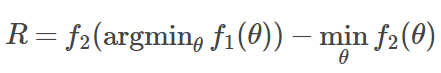 基本上,我们需要知道在 f_1 的极小值点处 f_2 的值,并与 f_2 的全局极小值进行比较,这是一种 Regret Expression,因此我用 R 表示。