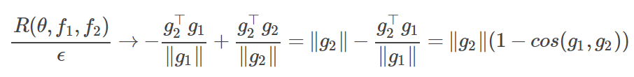然而,在深度学习中,损失函数 f_1 和 f_2 是非凸的,它们有许多局部极小值。所以一般来说,这个定义并不是特别有用。然而,在特定的参数值 θ 的小邻域内对 R 进行局部计算是有意义的。让我们考虑拟合一个受限的神经网络模型,其参数取值范围只在 θ 变量的 ϵ 邻域以内。如果 ϵ 足够小,我们可以假设损失函数在这个 ϵ 球面内具有唯一的全局极小值。此外,如果 ϵ 足够小,则可以使用对 f_1 和 f_2 的一阶泰勒近似,解析地在 ϵ 球面内找到近似极小值。为此,我们只需要在 θ 处计算梯度。如下图所示: