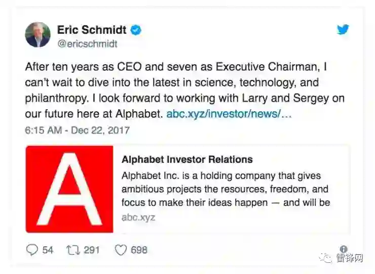 就在刚刚,Alphabet宣布:谷歌前CEO埃里克·施密特(Eric Schmidt)将会辞去Alphabet 执行主席职务。同时,施密特将继续担任公司的技术顾问,并将继续担任董事会董事。
