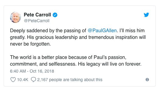 海鹰队教练 Pete Carroll 为他的去世感到悲伤: