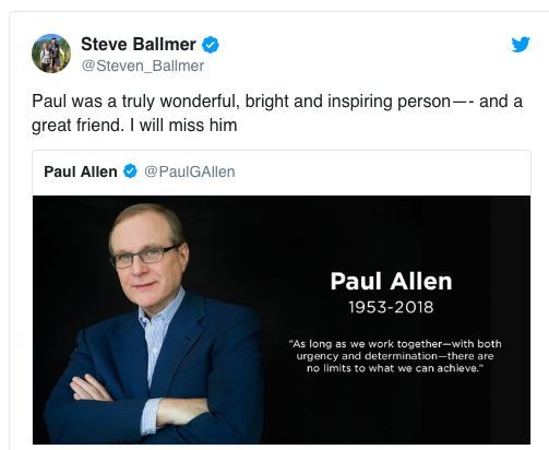 以及曾与他闹翻的前微软 CEO Steve Ballmer,此时也称 Allen 是“真正的伟大的、鲜明的、激励人心的人”:
