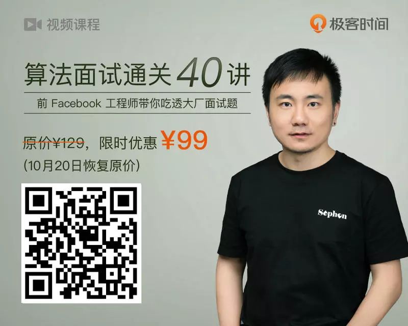 算法与数据结构是每个程序员的基本功,算法面试是每个程序员求职进大厂绕不开的话题。面试过 200+ 技术人的 Facebook 面试官覃超带你手把手通关算法面试,《算法面试通关 40 讲》视频课助你进大厂拿 offer,现在订阅有以下福利: