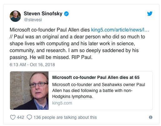 前 Microsoft Windows 部门总裁 Steven Sinofsky 在 Twitter 上表示,Allen“为计算机、科学、社区和研究做了很多事情”: