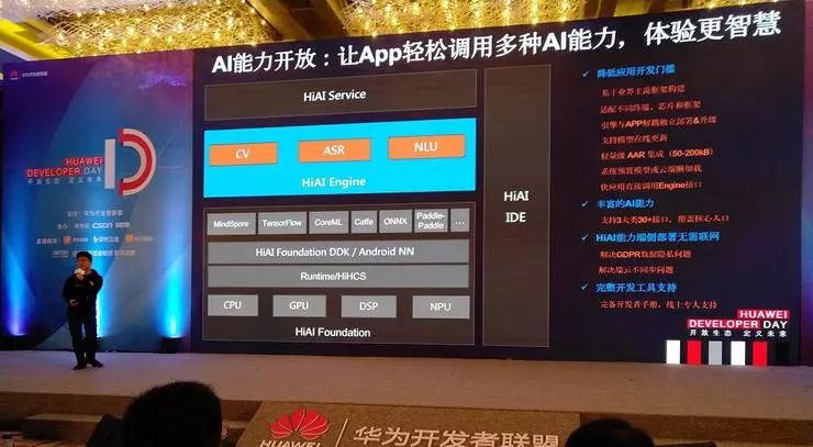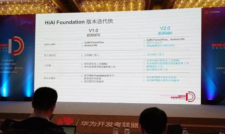 雷锋网在会场外与华为一位AI工程师进行交流后得知,麒麟980的NPU可以对端测的神经网络算法进行加速,效果最高可达50倍。同时华为的HiAI API还通过事先封装AI算法接口的方式提供能力层加速,开发者可以方便的调用接口接入AI能力。HiAI 2.0目前支持的算子数量已多达147个,远超安卓原生的NNAPI。