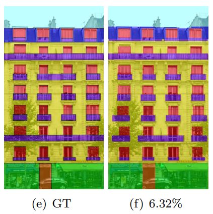 本文所展示的另外一组实验数据。Original是原始数据,Inpainted是根据对称信息去除遮挡的立面影像。(e)GT是真实语义分析结果,(f)是本文的语义分析方法错误百分比。