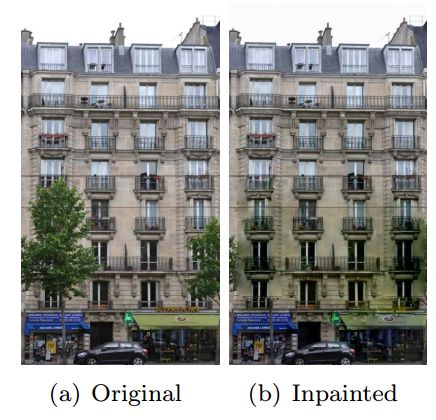 of symmetry information allows us to efficiently deal with large occluded areas and to recover plausible facade images with a minimum of occlusions.