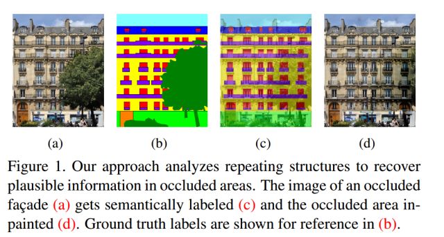 下图展示了本文利用建筑物里面的额对称信息对遮挡区域进行恢复,并进行语义分析的一个效果图。