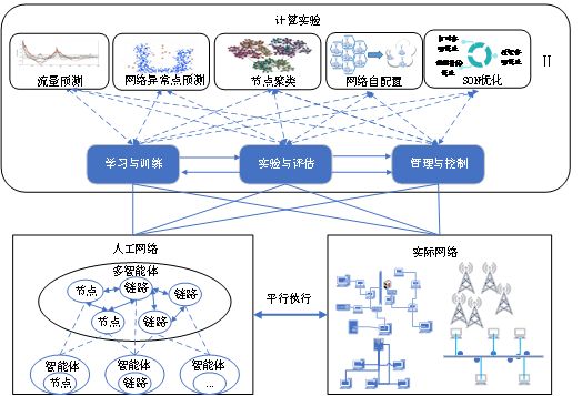 那么,如何提升网络的自适应控制能力,以较低的成本提升网络的服务能力?王飞跃等基于平行系统ACP方法提出了平行网络的解决方案。平行网络将网络中的实体和资源定义为逻辑独立的智能体,并将其组合成软件定义的人工网络系统,进一步提升了网络的开放性和灵活性。通过设置不同的规则在人工网络系统中构建大量的网络场景,运行产生完备的虚拟网络数据,并基于对数据的深度分析获得针对具体场景的最佳控制方案。通过人工网络与实际网络之间的虚实交互、平行执行,引导实际网络向更优化的人工网络运行,实现对实际网络的自适应优化管控。