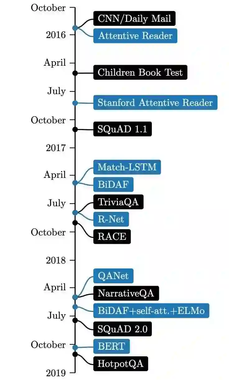 图 2.2:论文整理了神经阅读理解中数据集(黑色)和模型(蓝色)的最新重要进展。在这个表中,除 BERT (Devlin et al., 2018) 外,以相应论文的发表日期排序。