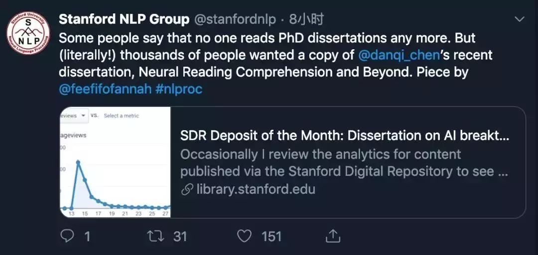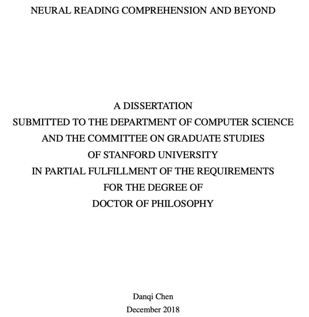 据斯坦福大学图书馆介绍,她长达 156 页的毕业论文《Neural Reading Comprehension and Beyond》上传仅四天就获得了上千次的阅读量,成为了斯坦福大学近十年来最热门的毕业论文之一。