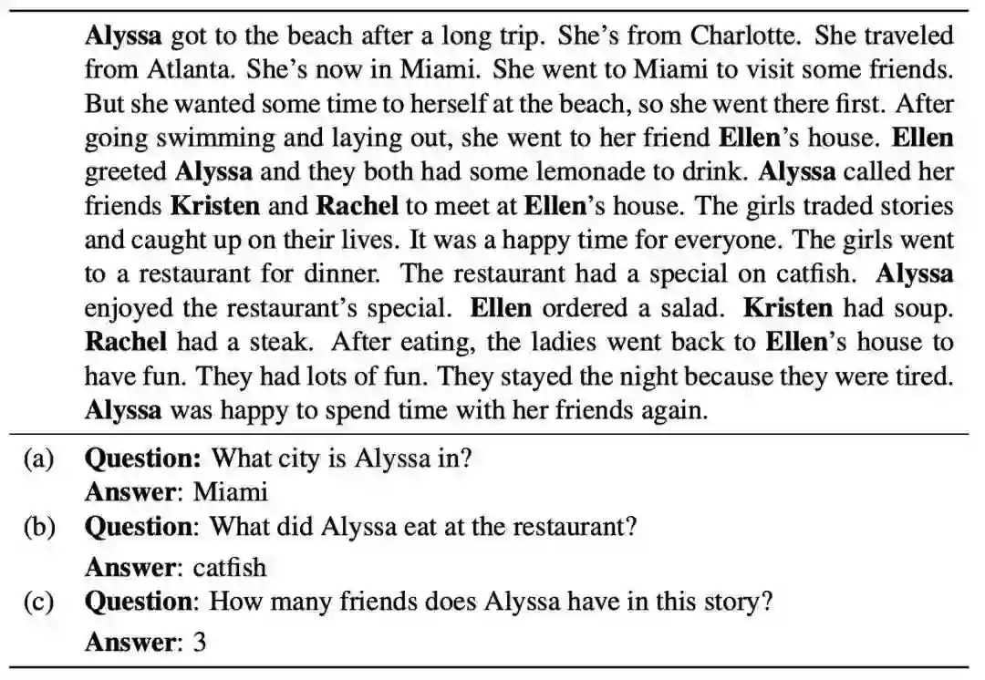 b)对于第二个问题「What did Alyssa eat at the restaurant?」,机器首先要找到句子:「The restaurant had a special on catfish.」和「Alyssa enjoyed the restaurant's special.」,然后理解第二个句子中 Alyssa 吃的 special 就是第一个句子中的 special。而第一个句子中 special 提到的是 catfish,所以最终正确答案是 catfish。