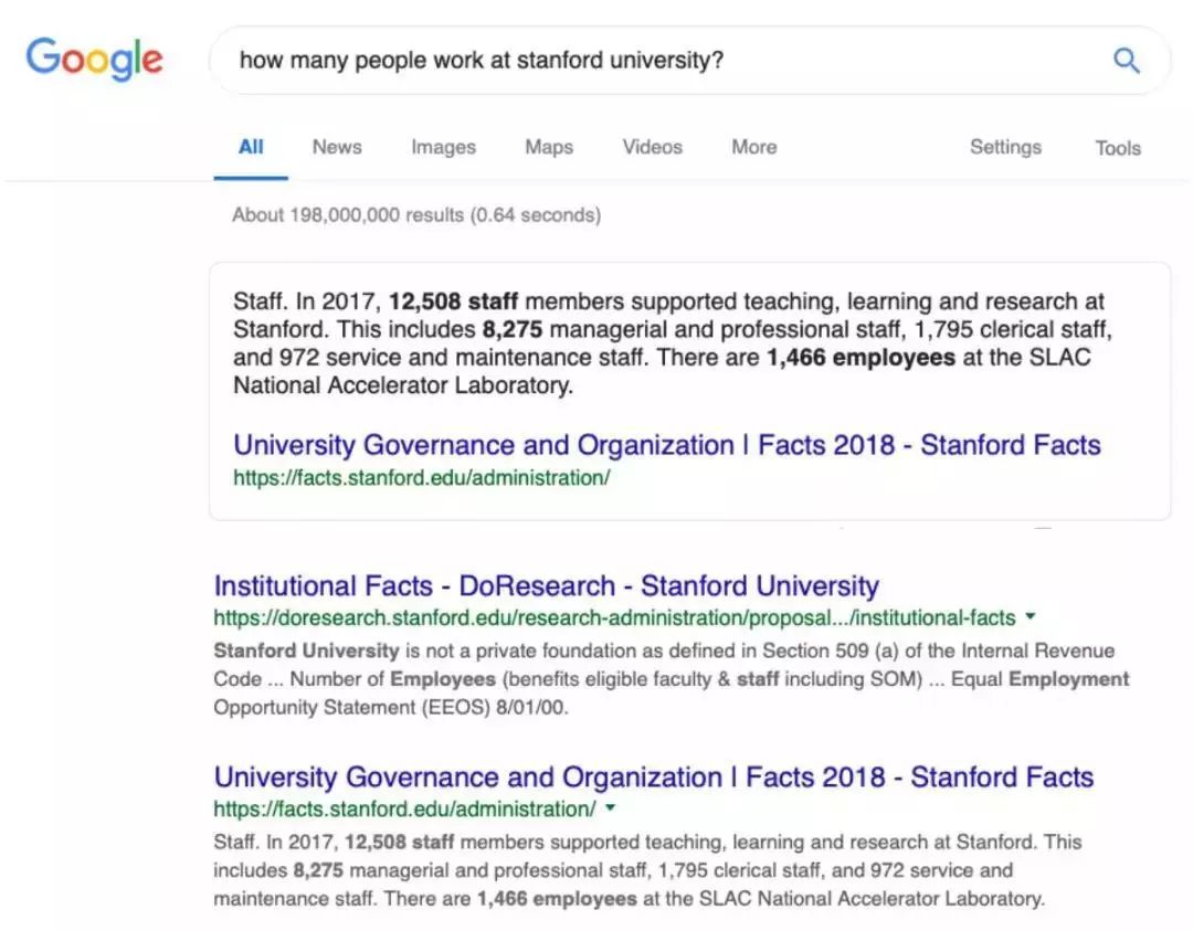 本文的第二个中心主题是,我们坚信,如果可以构建高性能的阅读理解系统,那这些系统将是建立诸如问答和对话系统等应用的关键技术。事实上,这些语言技术已经与我们的日常生活息息相关了。例如,我们在谷歌上搜索「有多少人在斯坦福大学工作?」(图 1.2),谷歌将不仅返回文档列表,还会阅读这些网页文档并突出显示最可靠的答案,并将它们展示在搜索结果的顶部。这正是阅读理解可以帮助我们的地方,使搜索引擎变得更加智能。而且,随着数字个人助理(如 Alexa、Siri、谷歌助手或者 Cortana)的发展,越来越多的用户通过对话和询问信息问题来使用这些设备。我们相信,构建能够阅读和理解文本的机器也将大大提升这些个人助理的能力。