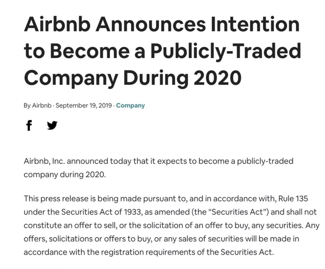 Airbnb此次宣布计划于2020年上市,似乎略晚于该公司的预期。Airbnb CEO 布莱恩·切斯基(Brian Chesky)今年4月曾表示,Airbnb准备在今年晚些时候上市。