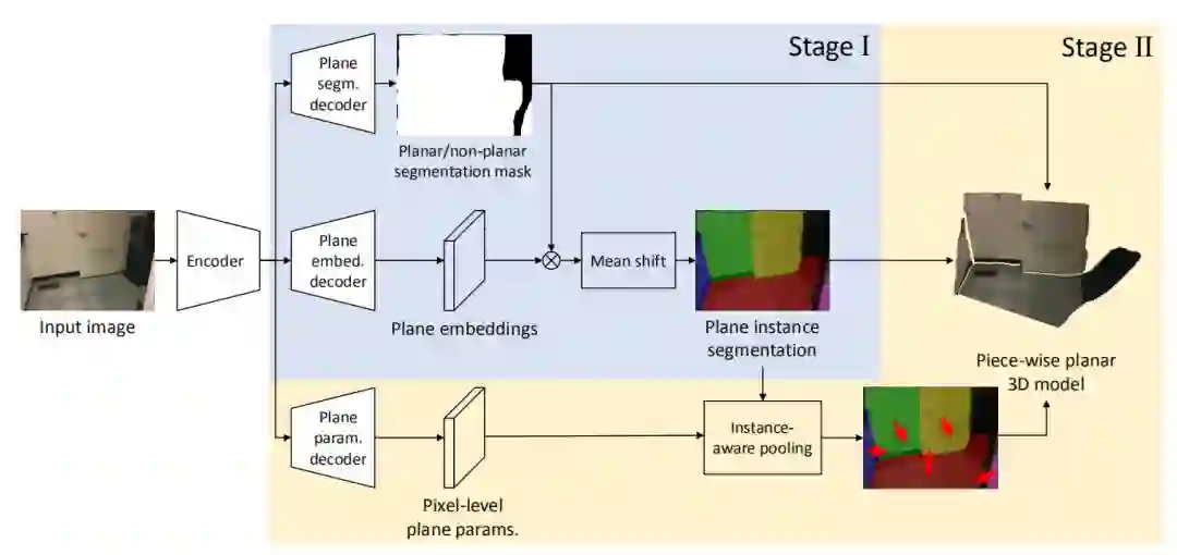 单张图像分割平面三维重建的目的在于同时分割平面实例并从图像恢复三维平面参数。最近一些方法利用卷积神经网络(CNN)能够获得有希望的结果。然而,这些方法仅限于检测具有某些学习顺序的固定数量的平面。为了解决这个问题,我们提出了一种基于关联嵌入的新颖的两阶段三维重建方法,其灵感来自于最近在实例分割方面的成功。在第一阶段,我们训练CNN将每个像素映射到嵌入空间,其中来自同一平面实例的像素具有类似的嵌入。然后,通过有效的均值漂移聚类算法将嵌入矢量在平面区域中分组,从而获得平面实例。在第二阶段,我们通过考虑像素级和实例级一致性来估计每个平面实例的参数。通过所提出的方法,我们能够检测任意数量的平面。对公共数据集的大量实验验证了我们方法的有效性。此外,我们的方法在测试时以30fps运行,因此可以应对许多实时应用,例如可视SLAM和人机交互。相关代码见:https://github.com/svip-lab/PlanarReconstruction.