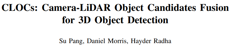 《CLOCs: Camera-LiDAR Object Candidates Fusion for 3D Object Detection》提出了一种新颖的 Camera-LiDAR 目标候选(CLOC)融合网络