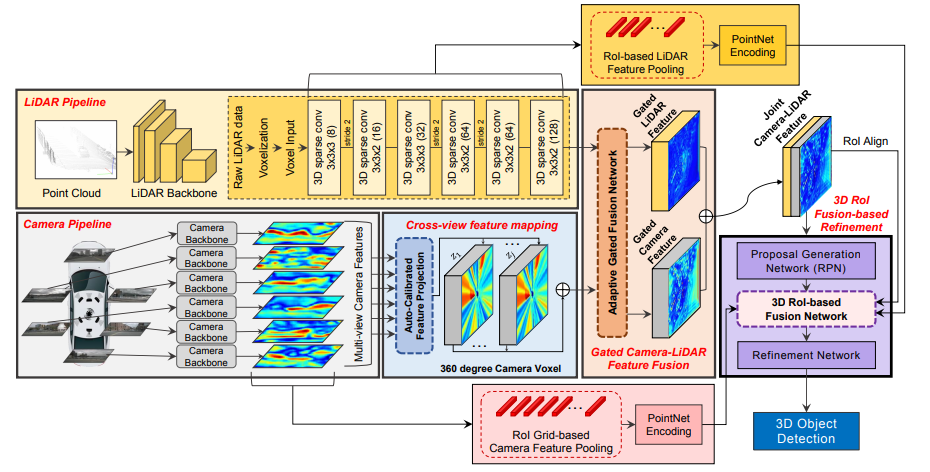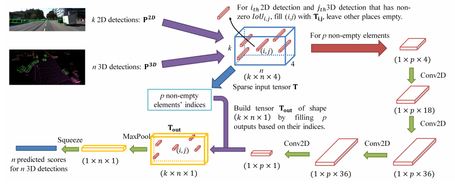 该网络由三个阶段完成:1)2D 和 3D 的目标检测器分别提出 proposal;2)将两种模态的 proposal 编码成稀疏张量;3)对于非空的元素采用二维卷积做对应的特征融合。