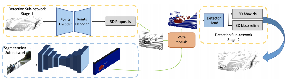 此外,基于 PACF 模块,研究人员提出了一个叫做 Pointcloud-Image RCNN(PI-RCNN)的 3D 多传感器多任务网络,该网络负责图像分割和 3D 目标检测任务。PI-RCNN 使用分段子网从图像中提取全分辨率语义特征图,然后通过功能强大的 PACF 模块融合多传感器特征。受益于 PACF 模块的效果和分段模块的有表达力的语义特征,PI-RCNN 使 3D 目标检测的性能大大改善。在 KITTI 3D 检测基准测试中的实验揭示了 PACF 模块和 PI-RCNN 的有效性,并且该方法可以在 3D AP 的度量标准上达到最新水平。