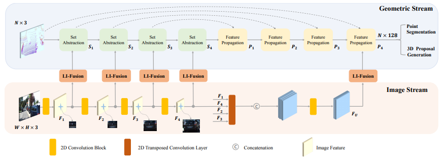 。该研究设计了一个端到端的可学习框架 EPNet 来集成两个组件。在 KITTI 和 SUN-RGBD 数据集上进行的大量实验表明,EPNet 优于当前最优方法。其网络结构点云分支是 point encoder-decoder 结构,图像分支则是一个逐步 encoder 的网络,并且逐层做特征融合。