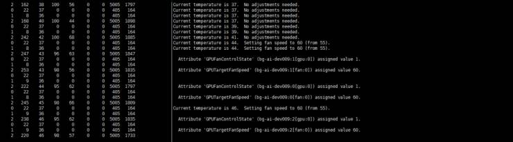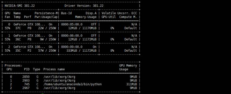 这里用的是2卡进行计算测试,我们可以看到,2卡的Perf(性能)一项已经被调整为“P2”(其它卡仍为P8),2卡的温度为35度,而且三个风扇的速度均为55%。“P2”指的是nvidia的显卡power state,从P0到P12,最高性能状态为P0,运行计算是为P2,最低功耗(最低性能)为P12。